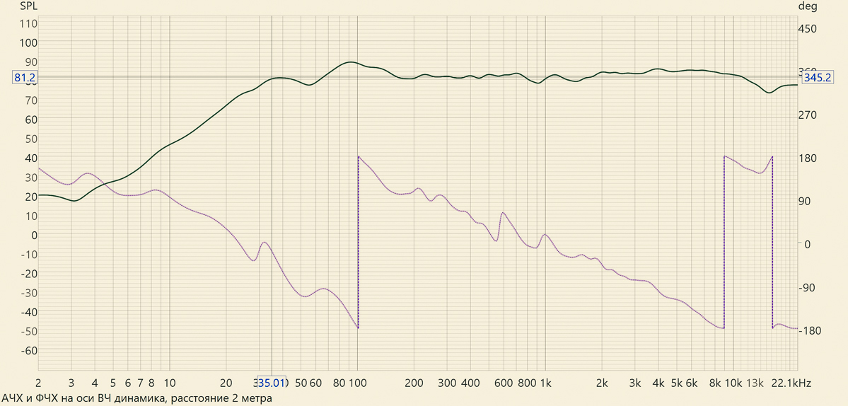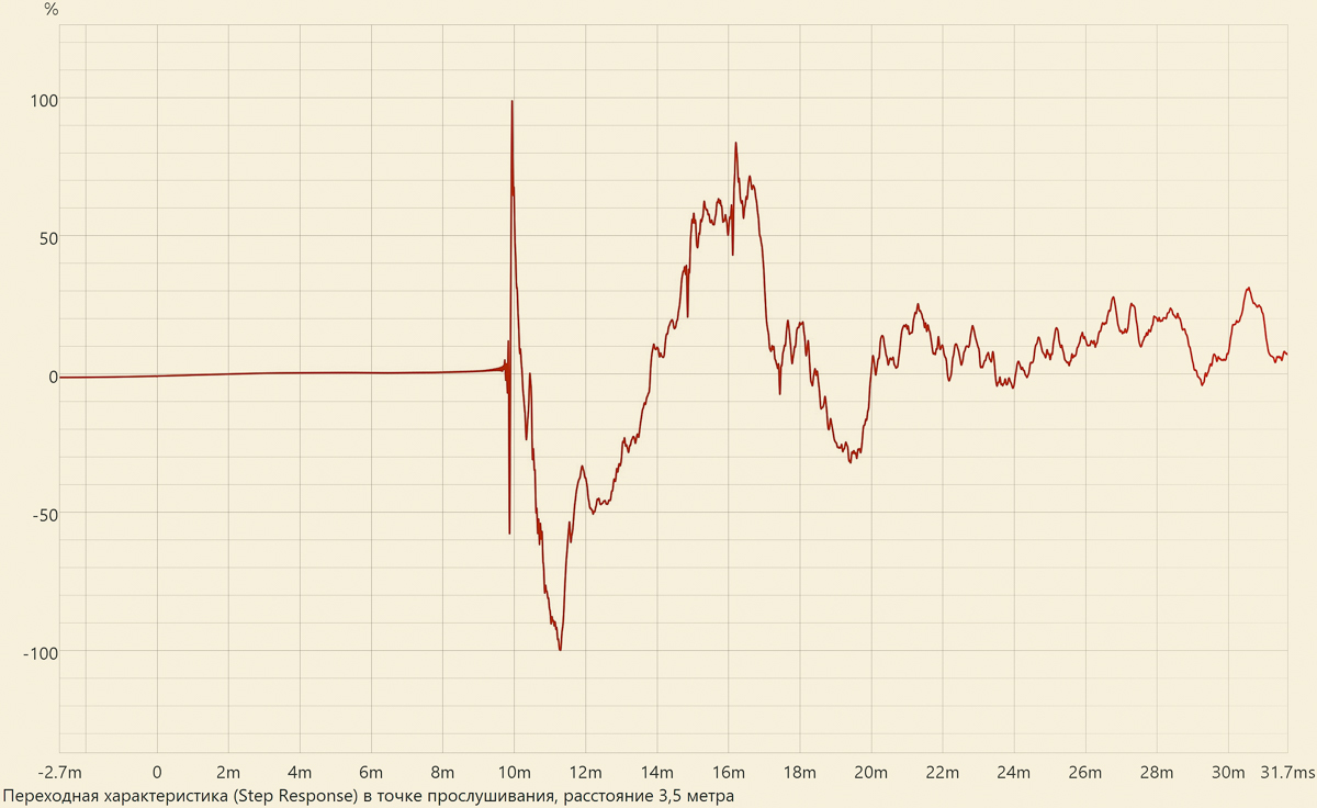Также мы измерили переходную характеристику на большем расстоянии, ниже оси, в реальной точке прослушивания. Форма импульса поменялась не сильно, в основном только добавились отражения помещения.