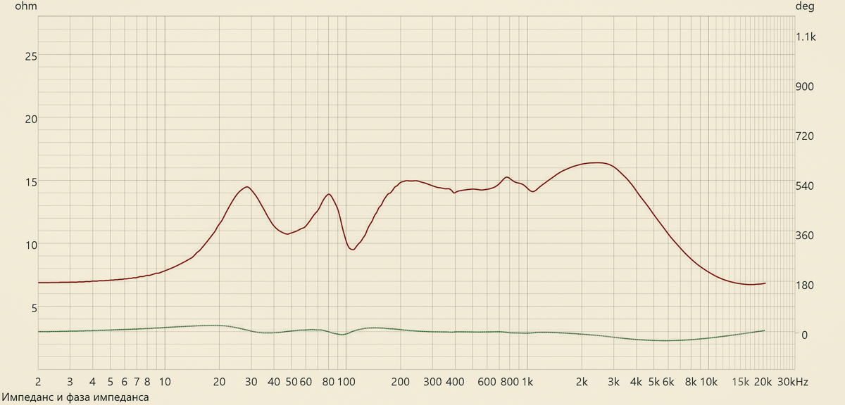 Во всем диапазоне частот импеданс не опускается ниже 7 Ом, и имеет очень хорошую равномерность в диапазоне 200-2500 Гц.